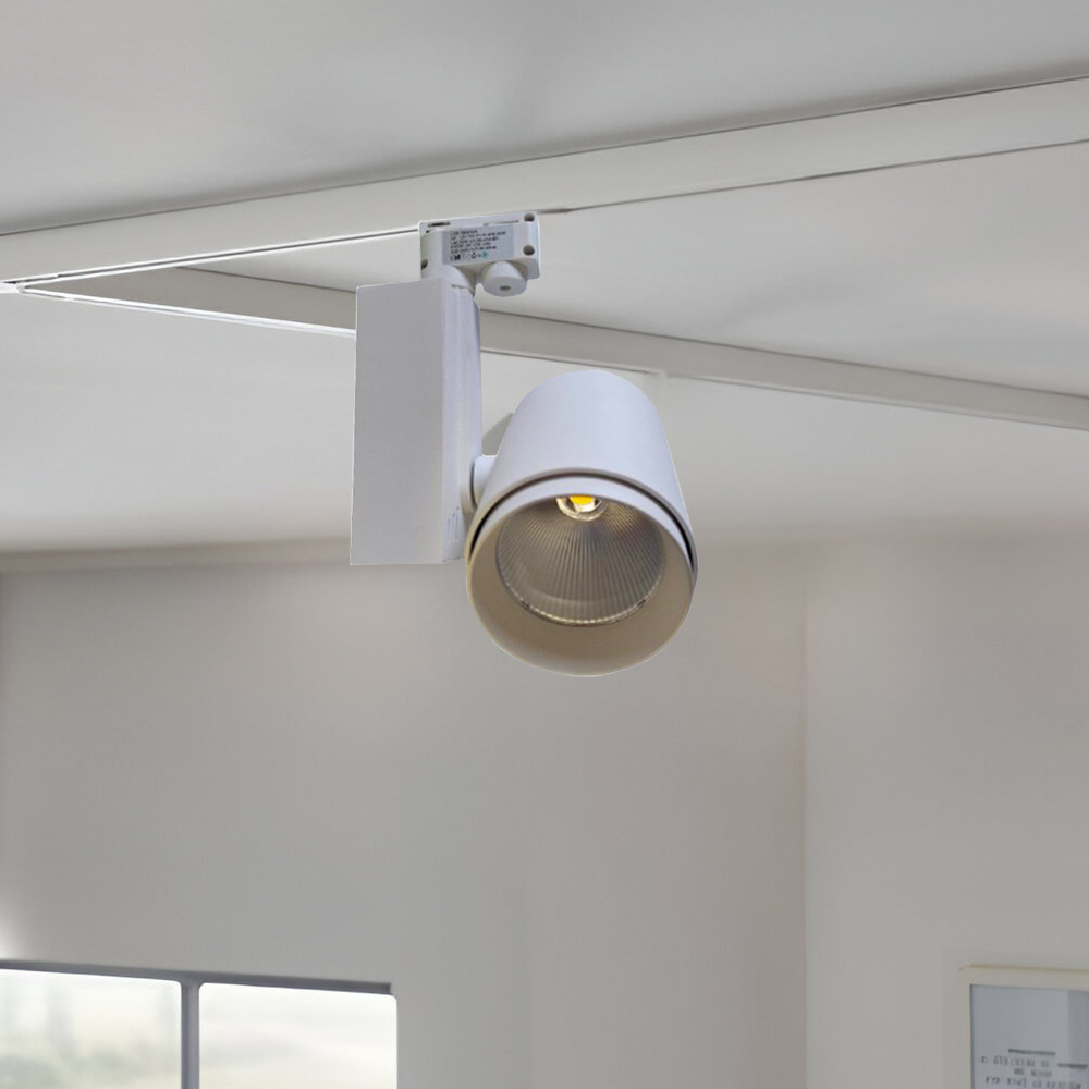 Lámpara direccionable LED, modelo LD174101-R. Fabricada en aluminio de color negro, gris, blanco, esta lámpara proporciona una iluminación con una potencia máxima de 30W. Con dimensiones de L140xD95xH190mm, es adecuada para realzar diversos ambientes como áreas comerciales. Compatible con voltajes de 200-240V 50~60Hz.